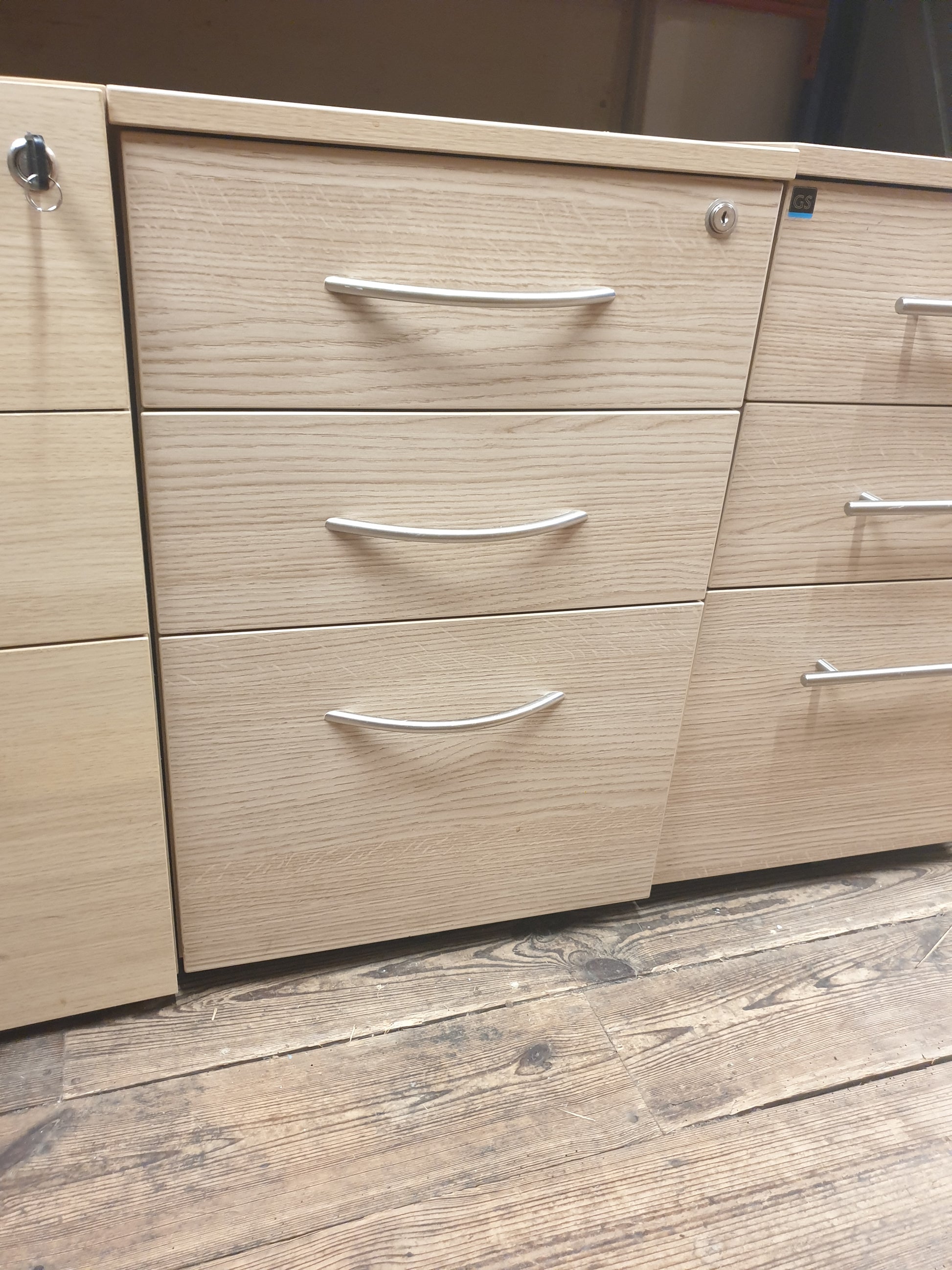 Wooden pedestal, lockable but keys need to be ordered online by customer where missing.